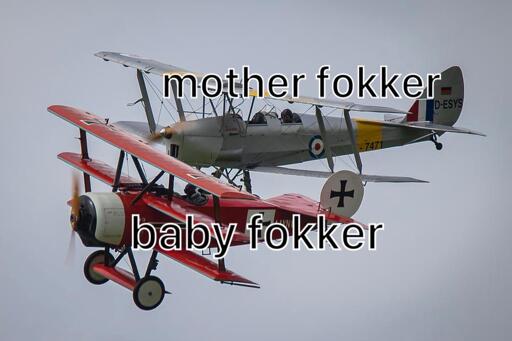 At this instant the girls in the auditorium start to giggle and boys start to laugh. The teacher stands up and says, “I think I should point out that ‘Fokker’ was the name of the German-Dutch aircraft company”