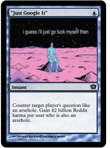 I think there’s a difference between making a claim (then I’m with you – provide a source, goddamnit) and getting asked a question where it’s obvious the asker hasn’t even tried finding out shit on their own. In the latter I think the card is right. I’m not your proxy for google.