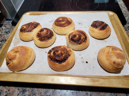 The recipe was easy enough to follow, but they came out a bit flat in the end, despite getting good height off the second rise. The recipe tells you to bake them on a sheet, but I think that was part of the issue with them spreading out. Next time I’ll put them in a pan with walls and cram them all together and hopefully that keeps them more uniform.