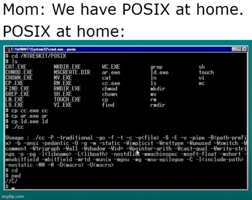 Spice Hoarder@lemmy.zip to linuxmemes@lemmy.world · 4 days agoWe have POSIX at homelemmy.zipimagemessage-square15fedilinkarrow-up1247arrow-down11