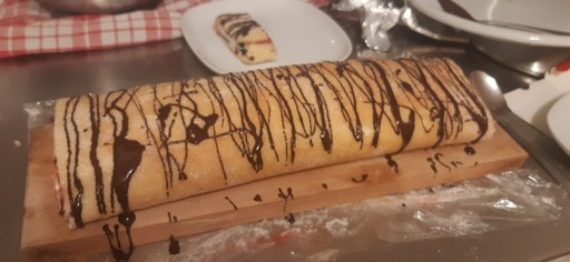 I have no idea what some of the recipes from my (dutch) book are called in english. This was a rolled up cake filled with whipped cream and homemade strawberry jam. The chocolate was a mess, but I’ll call it modern art 😅