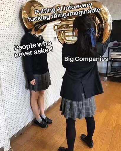 Made even funnier by the fact that that’s a tuba, played upright and the girl is holding it like a sousaphone. There is nowhere for her to blow into, so it won’t work.