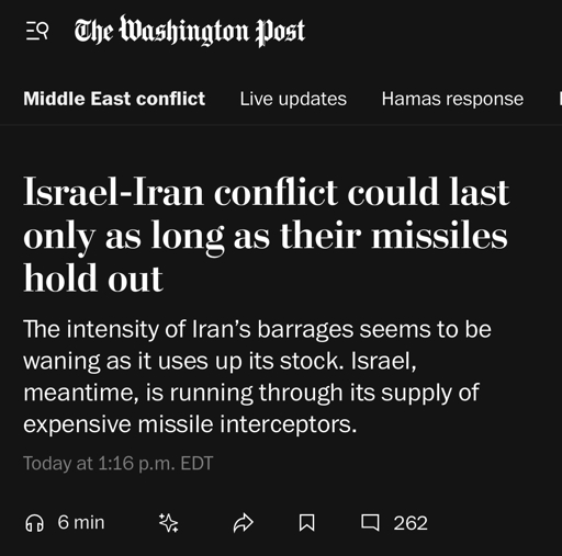 arrow-up11arrow-down1imageWashington Post: Israel has between 10-12 days of anti-missile munitions to protect against Iran without resupply missions from the United Statesplus-squarehexbear.netCoolerOpposide [none/use name]@hexbear.net to news@hexbear.netEnglish · edit-24 months agomessage-square0fedilink