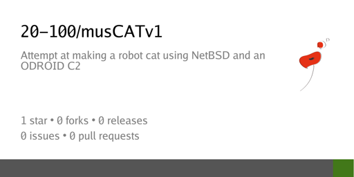 Jay🚩@lemmy.ml to Free and Open Source Software@beehaw.org · 2 months agoAttempt at making a robot cat using NetBSD and an ODROID C2plus-squarecodeberg.orgexternal-linkmessage-square0fedilinkarrow-up11arrow-down10